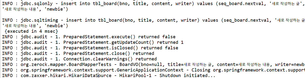 테스트 코드 실행 결과는 다음과 같다. BoardVO의 toString() 결과 bno 값이 null로 비어있는 걸 확인할 수 있다.