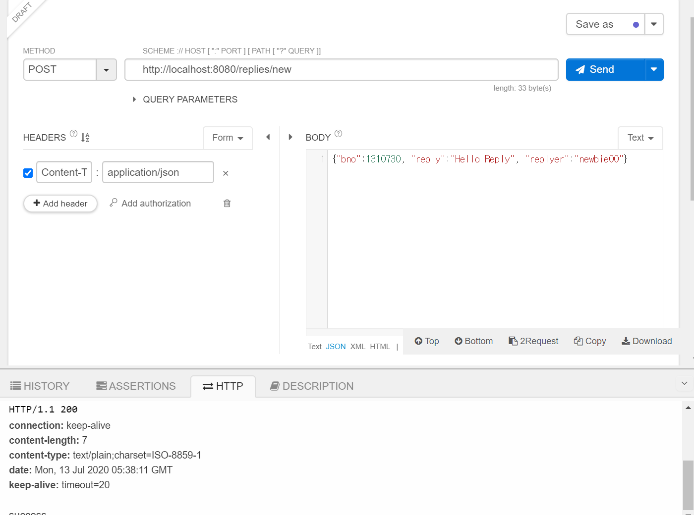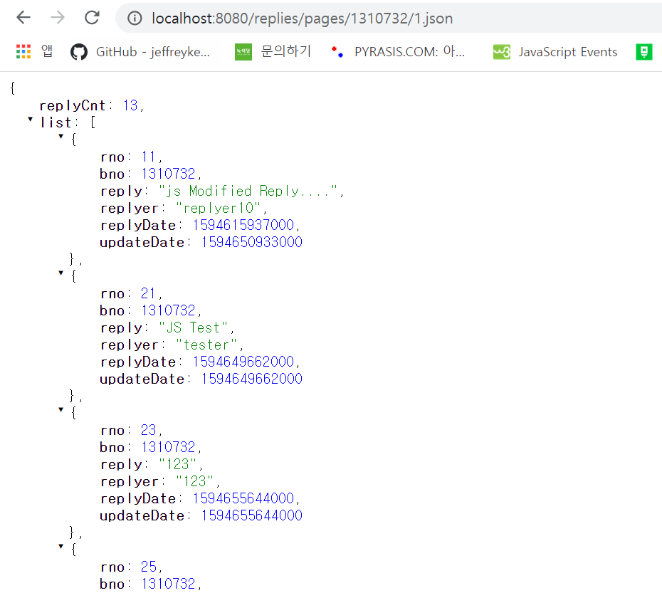 기존과 동일하게 JSON 페이지를 전송하지만 ReplyPageDTO 객체를 JSON으로 전송하게 되므로 특정 게시물의 댓글 목록을 조회하면 아래와 같이 replyCnt와 list 속성을 가지는 JSON 문자열이 전송된다.
