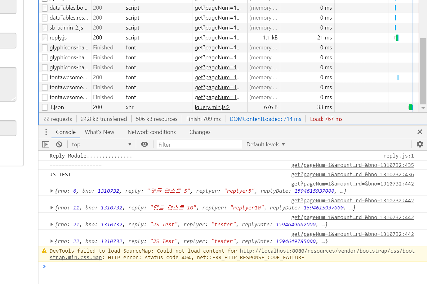 Ajax로 가져오는 데이터가 replyCnt와 list 데이터로 구성되므로 이를 처리하는 reply.js 역시 이를 처리하는 구조로 수정.