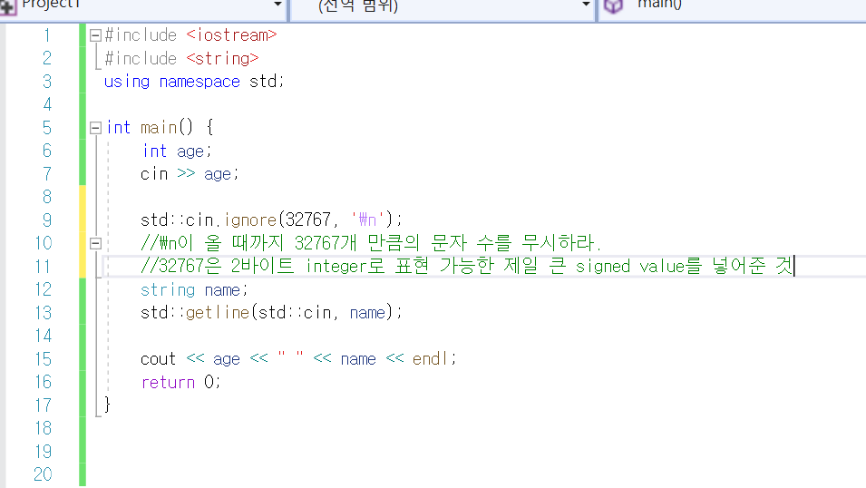 using namespace std;를 하면 후에 std::를 붙일 필요 없음
