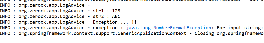 logException에 적용된 @AfterThrowing은 pointcut과 throwing 속성을 지정하고 변수 이름을 exceiption으로 지정한다.