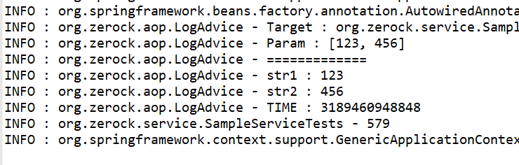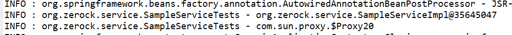 SampleServiceTests에서 가장 먼저 작성해봐야 하는 코드는 AOP 설정을 한 Target에 대해 Proxy 객체가 정상적으로 만들어졌는지 확인. aop:aspectj-autoproxy가 정상적으로 모든 동작을 하고 LogAdvice 설정 문제가 없다면 service 변수의 클래스는 단순히 org.zerock.service.SampleServiceImpl의 인스턴스가 아닌 생성된 프록시 클래스의 인스턴스가 된다.