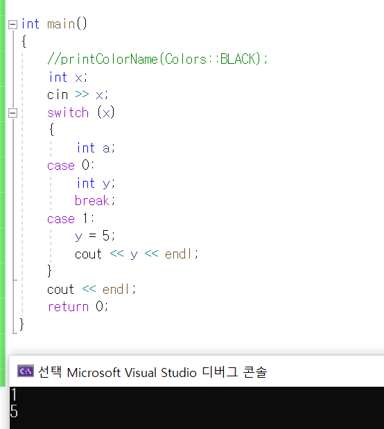 case 안에 어떤 변수를 선언해도, swtich문 바로 전(즉 case들 직전)에 선언된 것처럼 작동한다.