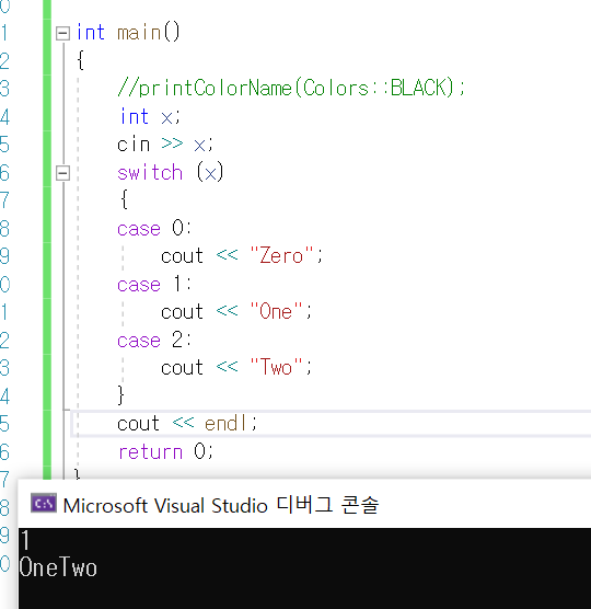 if문과는 다르게 case 1이 걸리고 나서 그 case에 break가 없으면 뒤에 것이 모두 출력된다.