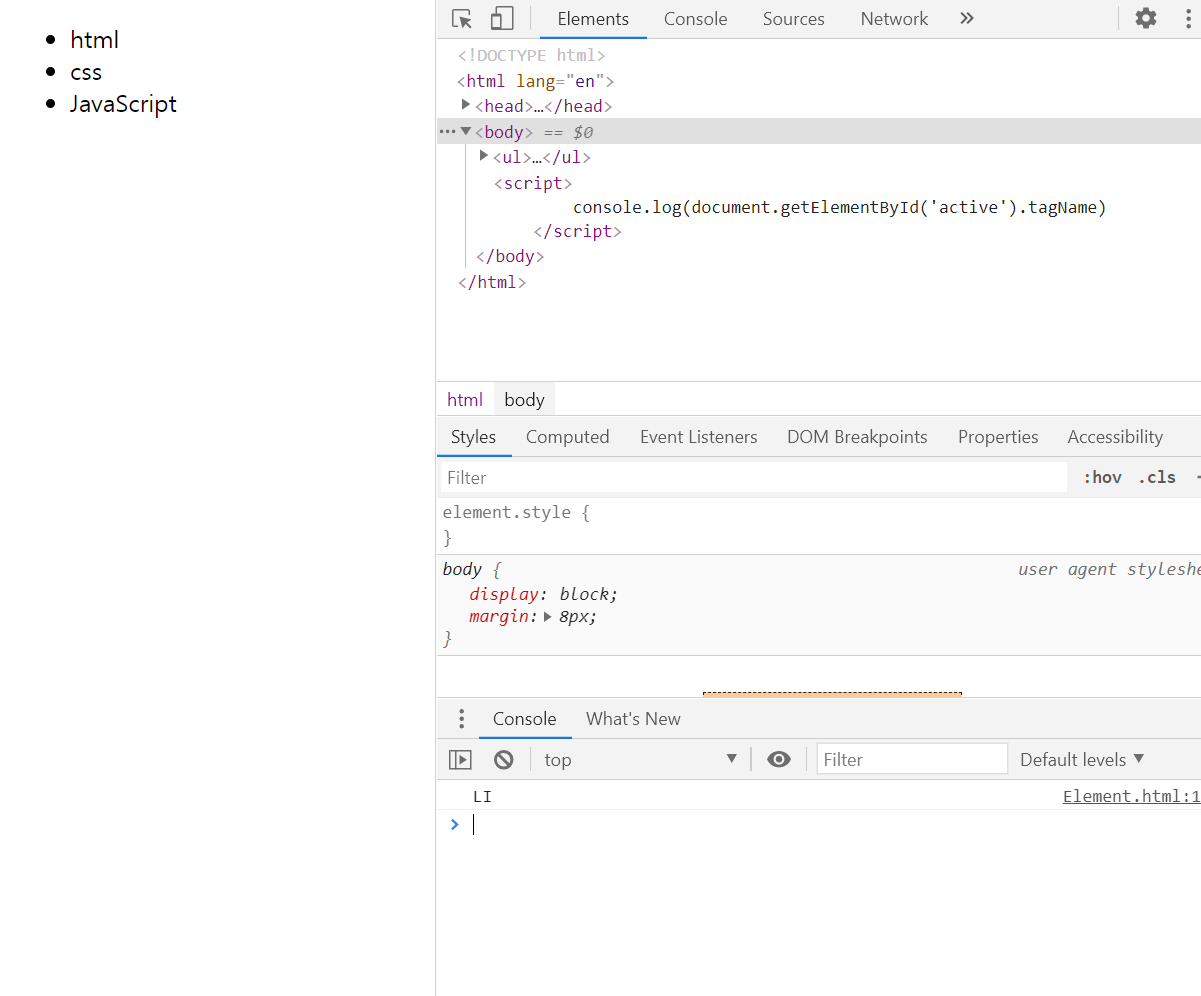 console.log(document.getElementById('active').tagName)