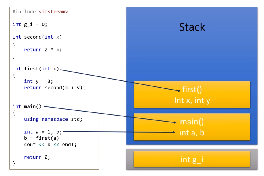 foo(6, 7); //6, 7 : arguments (actual parameters) = 실매개변수